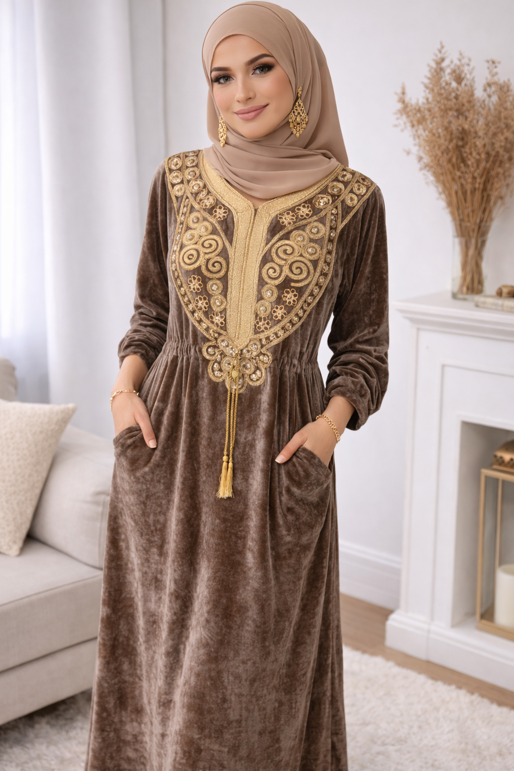 Gandoura longue en velours avec poches, Robe orientale d’hiver & taupe
