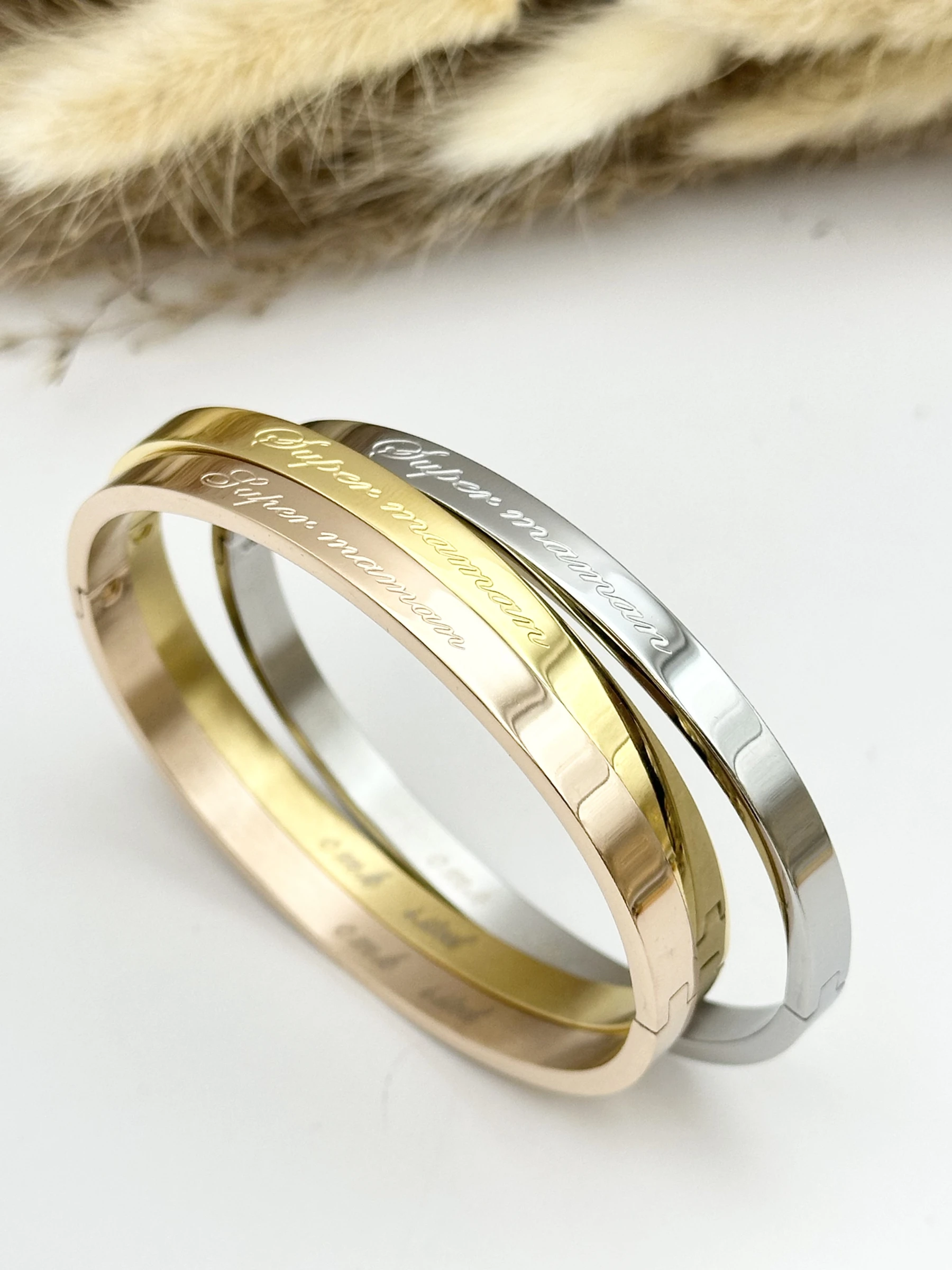 Gravé avec les mots « Super Maman », ce bracelet est un symbole d’amour et de reconnaissance envers la femme extraordinaire qui incarne la maternité.