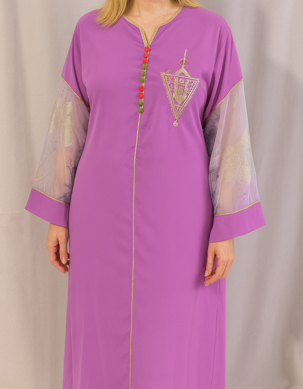 Disponible en tailles M et L , ce caftan est conçu pour convenir à diverses morphologies, assurant un ajustement flatteur et confortable pour toutes les silhouettes. - Couleur violet claire