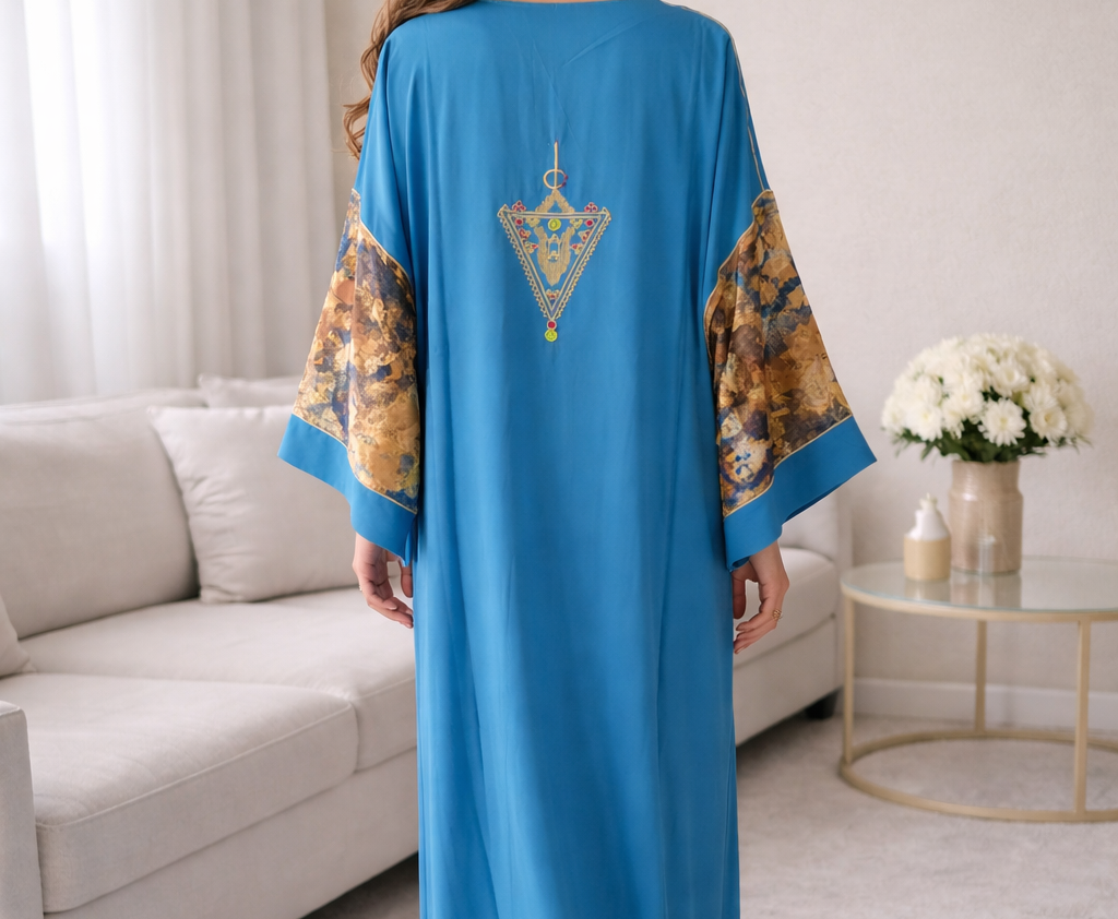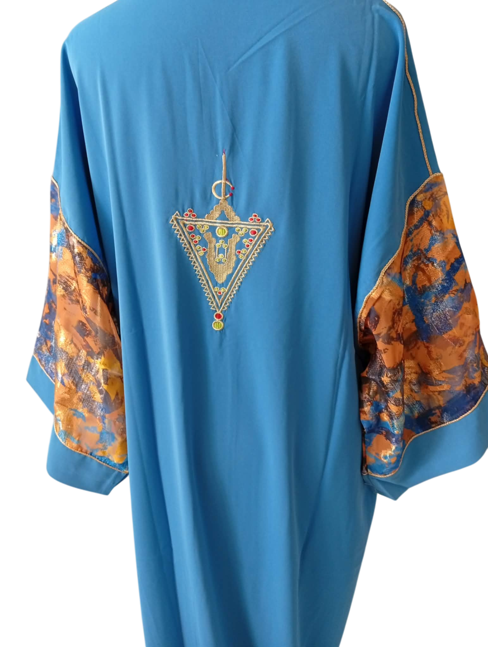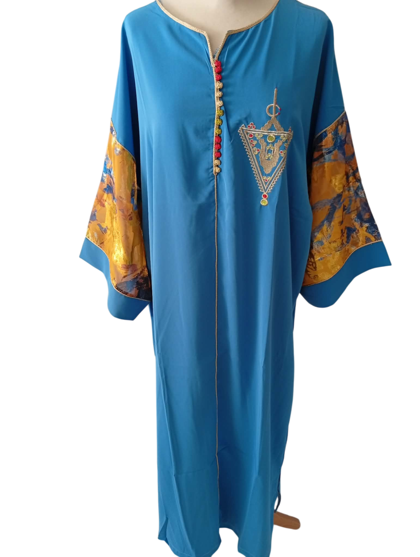 Elle se distingue par ses broderies délicates et ses manches Tlija travaillées avec finesse, apportant une touche traditionnelle et chic.