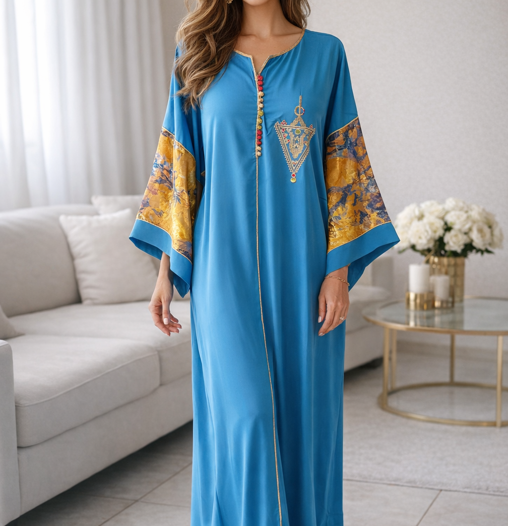 Sublimez votre allure avec cette gandoura élégante confectionnée en crêpe de soie, un tissu fluide, léger et raffiné.