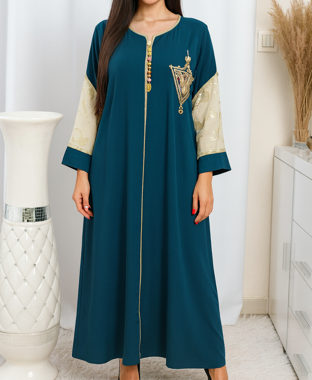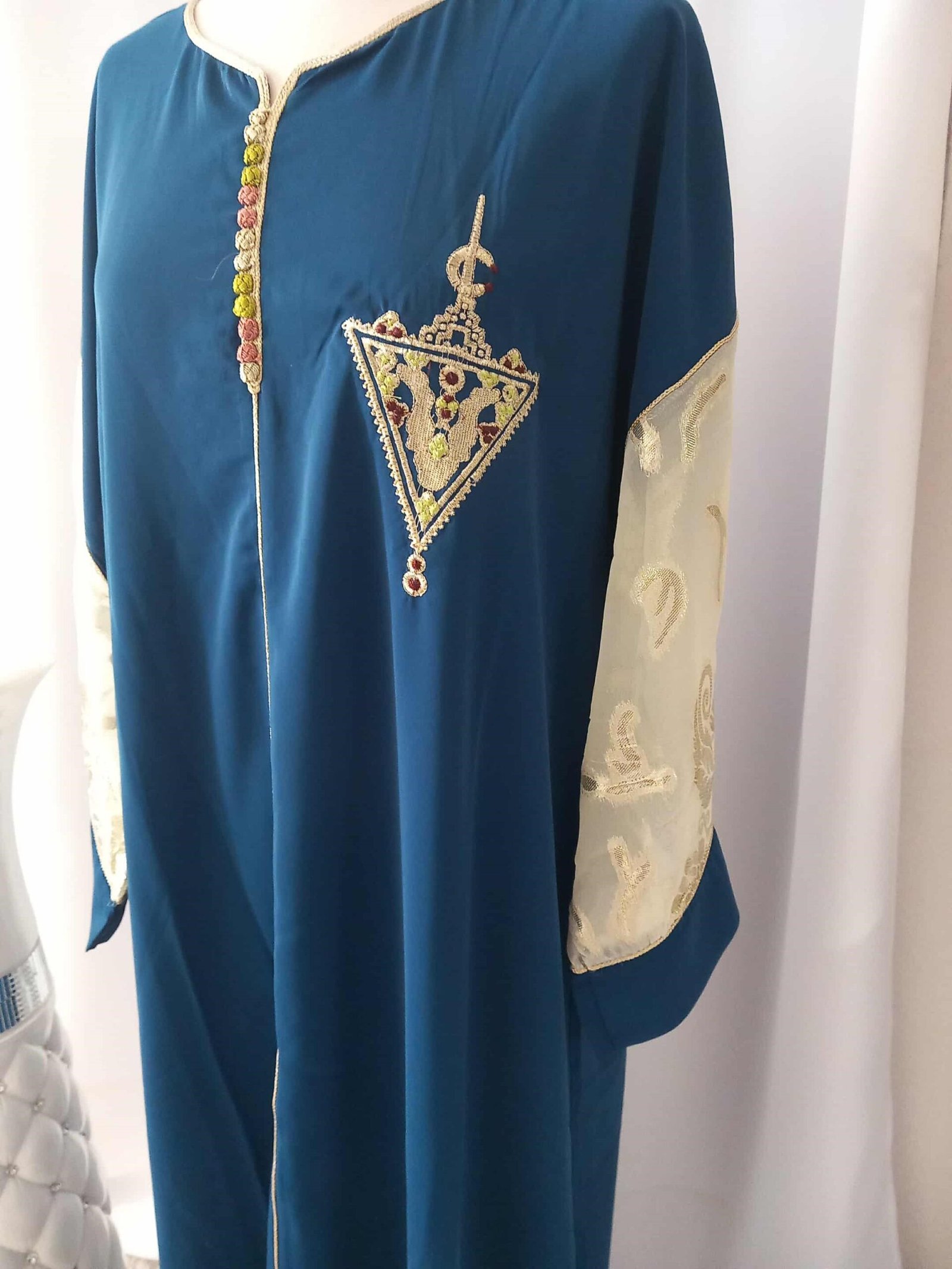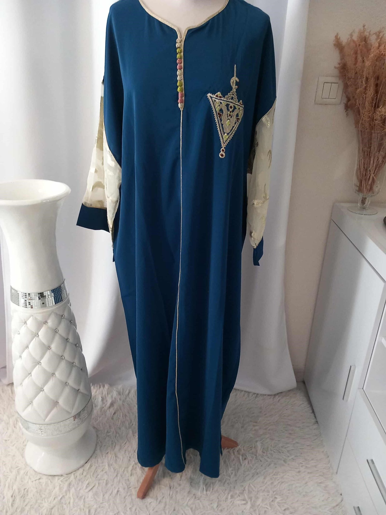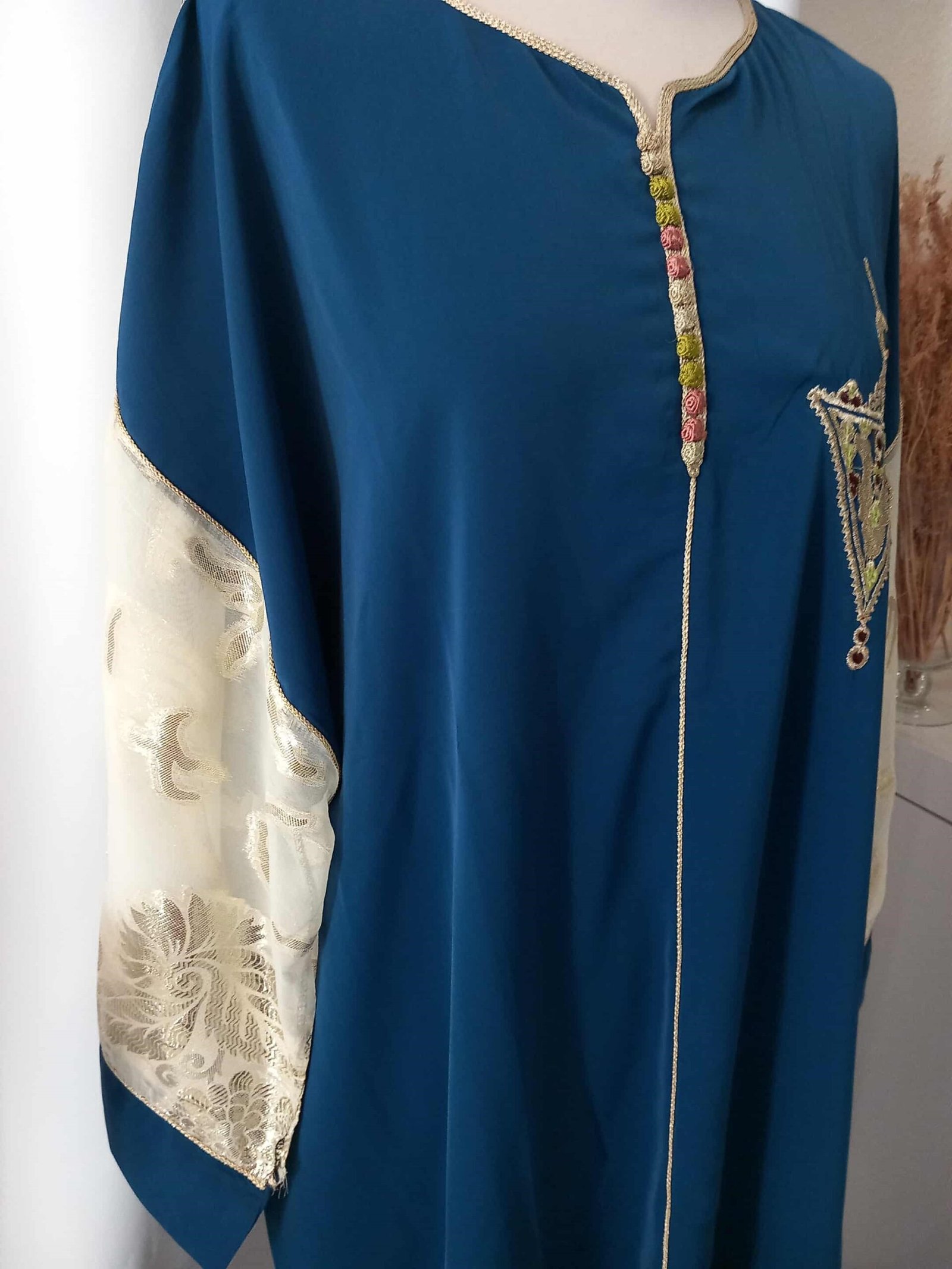 Sublimez votre style avec notre gandoura en crêpe de soie bleu pétrole, une tenue qui allie modernité et tradition.