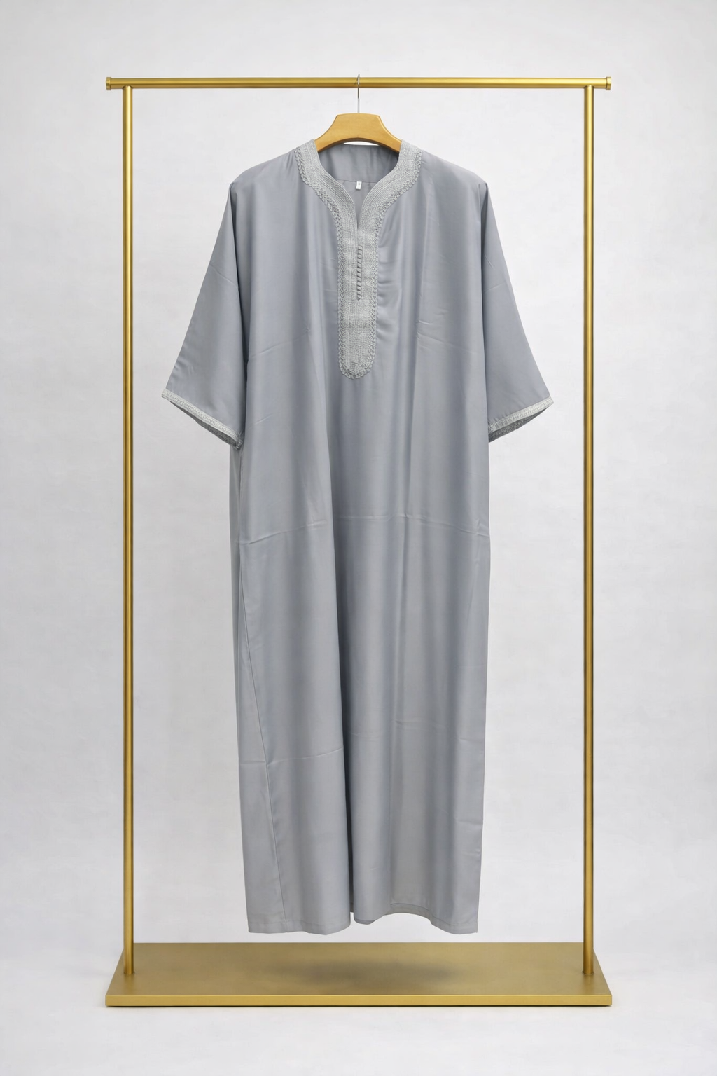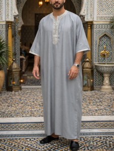 Découvrez notre gandoura grise brodée pour homme, une pièce traditionnelle fabriquée au Maroc.