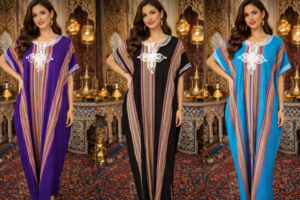 Découvrez cette magnifique gandoura marocaine à rayures, parfaite pour allier style et confort au quotidien.
