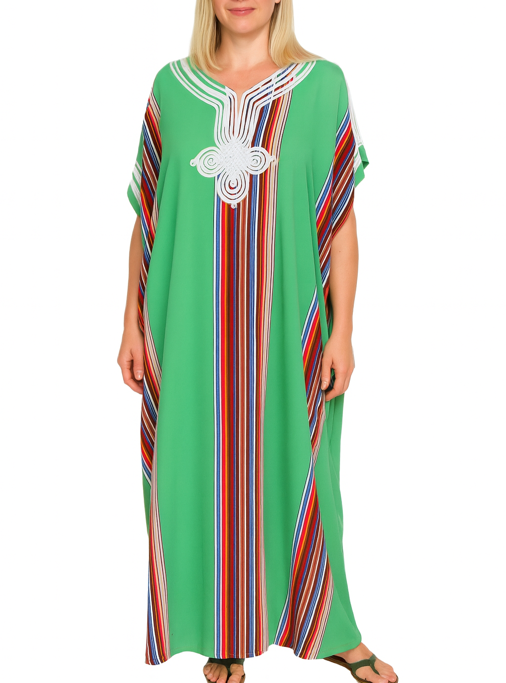 Optez pour l’authenticité et la simplicité avec cette gandoura de couleur vert pistache à rayures, confectionnée dans un tissu de qualité en viscose.