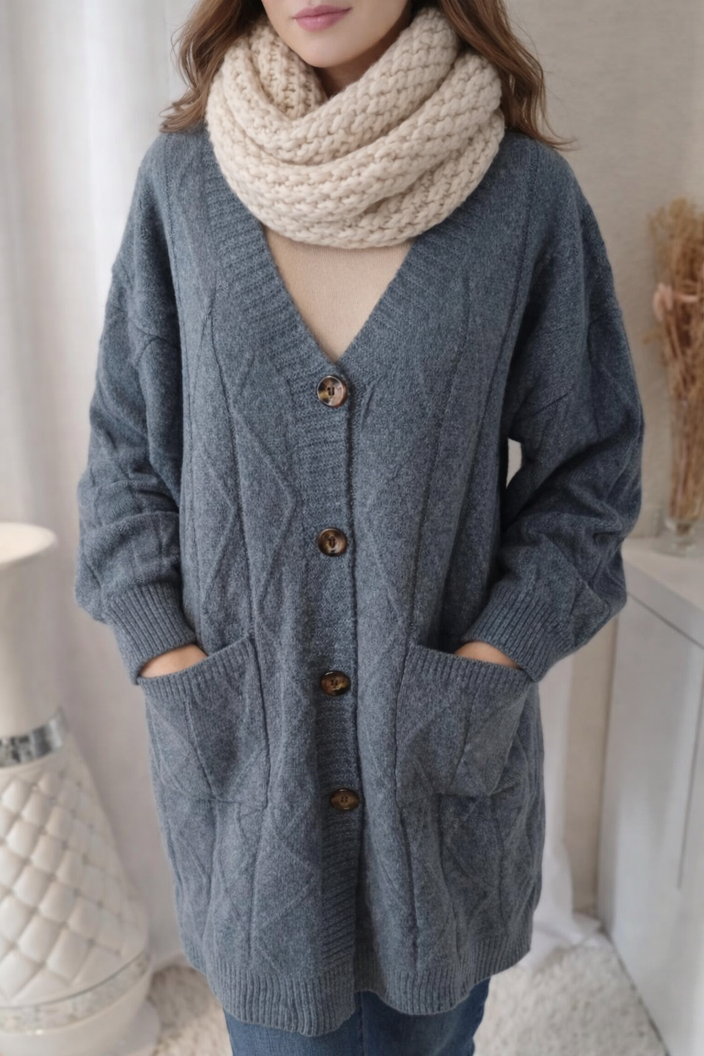 Ce gilet long se distingue par son motif géométrique élégant, ses deux poches pratiques, et sa coupe fluide qui s’adapte facilement à toutes les silhouettes. Il est confectionné dans une matière douce et agréable à porter, parfaite pour affronter les saisons fraîches avec style.