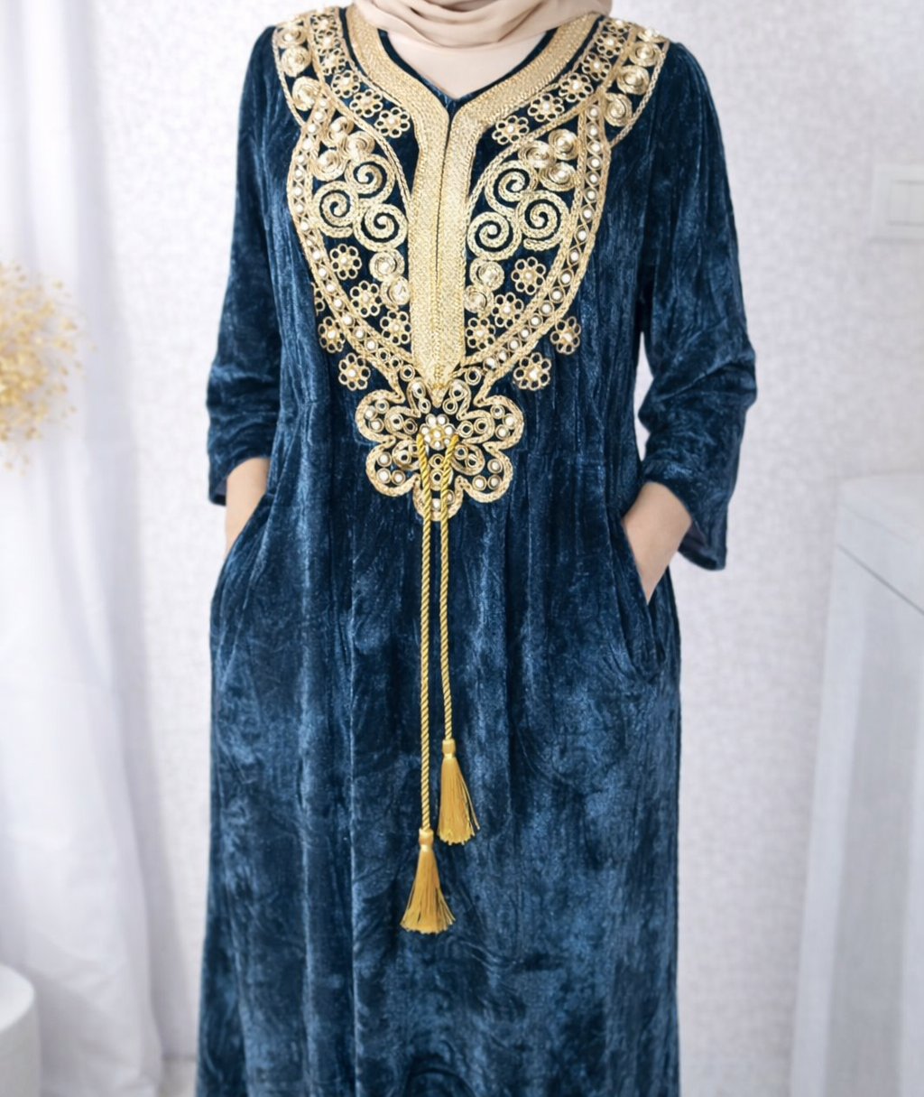 Gandoura Longue d’Hiver – Robe orientale bleu jean